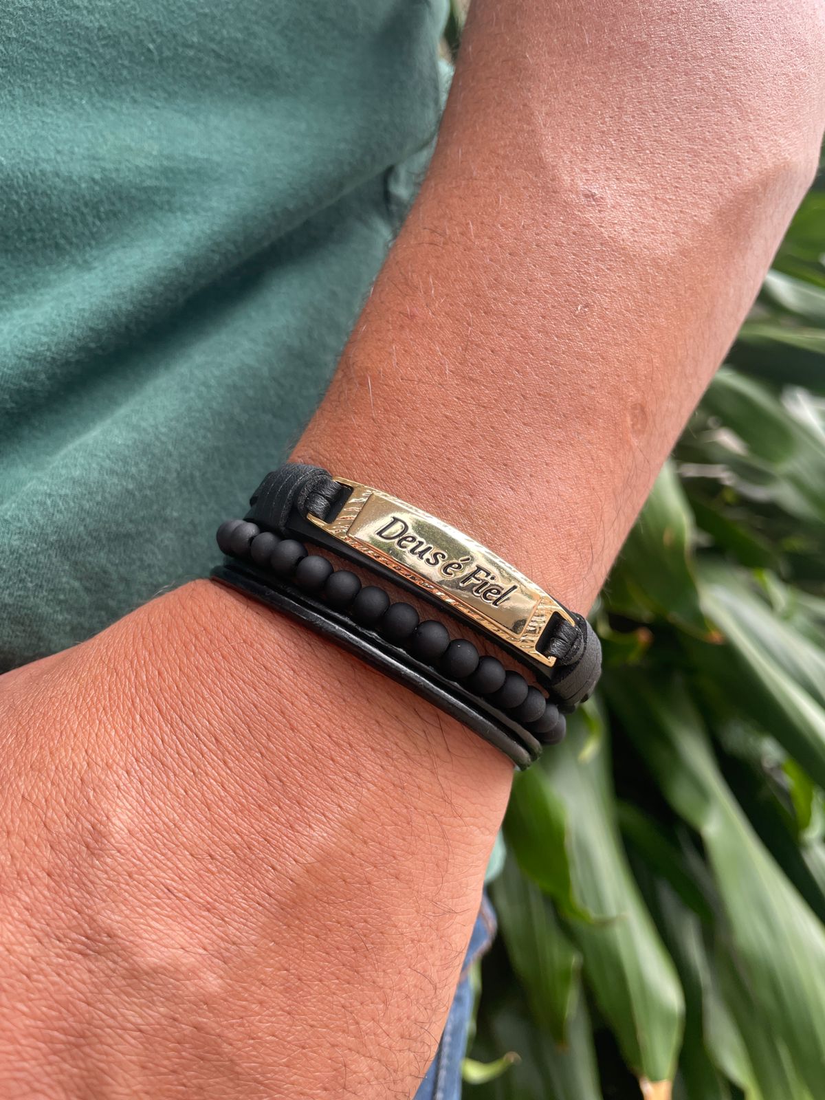 - Mix composto por 3 pulseiras, sendo uma pulseira em couro com fecho ima, uma de bola sintetica 8mm de regular, e uma de couro regulavel